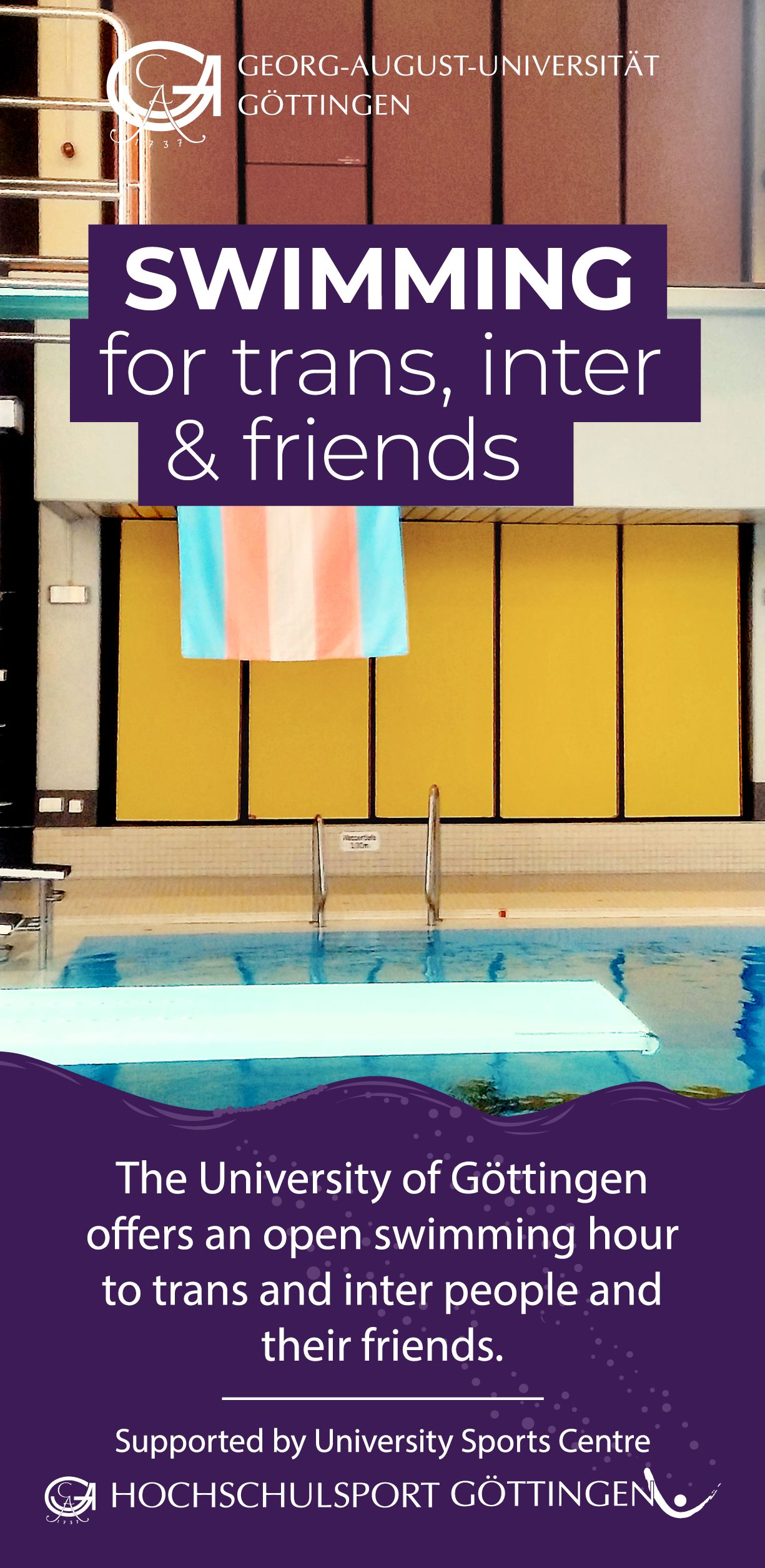 The open swimming hour specifically addresses all trans and inter people who like to swim and enjoy leisure time without the common obstacles in public swimming areas. Also all people who tend to avoid public swimming areas because of body shaming, e. g. scars or body shape are welcome at the swimming.The pool area as well as the changing rooms will be opened exclusively for trans and inter people and their friends. All areas will be void of gendered markers and body-related rules. Thus, everyone is welcome to participate regardless of their (current) body shape or preferred swimming clothes.